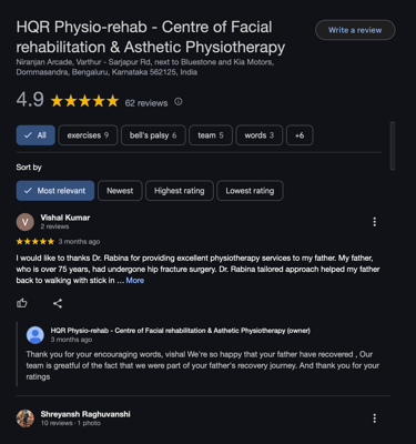 Words will be less to express my immense gratitude and thanks to Dr Meghna Dave for her immediate and superb team to help me through my difficult journey of Bells Palsy, i recovered 90% in a record 17 days after being diagnosed - today being Day 24, i am just glad that I came across her and HealthQ Rehab through her Youtube video on the correct exercies and process to deal with Bells Palsy - Thank You!